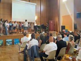 Am Donnerstag versammelten sich die Schulgemeinschaft und zahlreiche andere Gäste für die Amtseinführung von Herrn Dr. Zöllner gegen 10 Uhr in der Aula der Schule. Die Veranstaltung wurde mit dem Chor der Klassen 5-7 unter Leitung von Frau Dederichs eröffnet. Musikalisch umrahmt wurde die Veranstaltung durch Herrn Joswowitz am Klavier sowie Isabelle Harms mit der Flöte und Aliena Krull (beide aus der Q2) an der Violine.