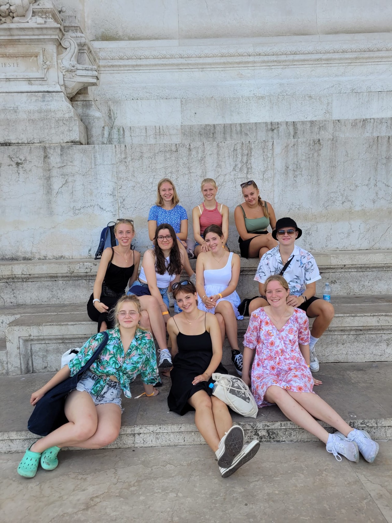 Dann waren wir befreit für den Abend und gingen in kleinen Gruppen essen oder die Stadt auf E-Scootern unsicher machen. Italienisches Essen in Rom ist einfach etwas Besonderes. Pasta, Pizza und Co mit seinen Freunden sollte man sich nicht entgehen lassen! Nächster Tag, nächste Sehenswürdigkeit. Morgens saßen alle (mehr oder weniger pünktlich…) am Frühstückstisch, um danach gegen halb 10 Richtung Kolosseum zu gehen. Eines kann man sagen: Wir sind viel gelaufen! Am Ende jedes Tages haben wir festgestellt, dass jeder von uns mindestens 20.000 Schritte täglich gemacht hat. Zuerst ging es zum „Forum Romanum“. Das Gelände ist riesig und die Ruinen beeindruckten. Zu jeder Sehenswürdigkeit wurde von den Schülern des Deutsch LKs ein Referat gehalten. Jasper und Alex schilderten, wie das Forum Romanum Mittelpunkt des politischen, wirtschaftlichen und kulturellen Lebens war. Durch die Atmosphäre fühlte es sich an, als wäre man in einer anderen Zeit. Zweifellos sieht man den Gebäuden ihr Alter an, aber gleichzeitig ist es für uns alle unvorstellbar gewesen, dass sie von Menschenhand unter damaligen Bedingungen erbaut wurden. Trotz der Hitze ließen es sich einige nicht nehmen, nach oben zur riesigen Aussichtsplattform zu laufen, von der man das gesamte Forum Romanum überblicken konnte. Danach ging es weiter zum Kolosseum. Wer von uns bis dahin keine Ahnung hatte, welchen Zweck dieses Gebäude vor Tausenden von Jahren hatte, erfuhr das von Sarah und Carlotta. Sie erklärten, das Kolosseum diente als Austragungsort grausamer Kämpfe zwischen Tieren und Menschen oder wurde für Wasserballett geflutet. Heute ist die Ruine eines der berühmtesten Wahrzeichen von Rom. Es ist fast unvorstellbar, was hier vor Tausenden von Jahren passiert ist. Danach ging es aus der Mittagshitze in kleinen Gruppen durch Rom. Am dritten Tag verbrachten die Leistungskurse den Vormittag getrennt. Wir besuchten die vielen Sehenswürdigkeiten, die Rom zu bieten hat! Für jede Sehenswürdigkeit war ein Referat vorbereitet und so lernten wir etwas über das Viktor-Emanuels Denkmal (von Aliena und Klara), den Piazza Navona (von Carlos und Luca), das Pantheon (von Annika und Lena) und den Trevi Brunnen (von Isabelle und Tabea), wo wir alle gemäß der Tradition eine Münze in den Brunnen warfen. Bei der spanischen Treppe (Vortrag von Sarah und Amélie) trafen die beiden LKs wieder aufeinander und die Lehrer spendierten der ganzen Stufe ein Eis. 60 Schüler, die sich alle nicht für eine Eis-Sorte entscheiden konnten… Man kann sich vorstellen, wie lange das gedauert hat! Abends hatten wir dann wieder Zeit mit unseren Freunden, um den Abend ausklingen zu lassen. Dank der Lehrer, die sich etwas umgehört hatten, bekamen wir die Chance auf ein Event mit Musik, Tanz und Essen zu gehen. So mischten wir uns etwas unter die Einheimischen. Stressig wurde es, als die Metro überraschender Weise ausfiel, wir aber um 1.00 Uhr auf den Zimmern sein sollten und deshalb um viertel nach eins gestresst in einen völlig überfüllten Bus voller Italiener sprangen und uns die Zeit mit dem Singen von deutschen Kulturschlagern und Geburtstagsliedern für Kevin vertrieben. Erstaunlicher Weise kamen wir alle halbwegs pünktlich, mit einigen Minuten Verspätung an. Am vierten Tag standen das Vatikanische Museum und der Petersdom auf dem Programm. Der Weg dorthin war ziemlich sportlich und dauerte eine Stunde. Um die riesige Kirche im Vatikan zu betreten, musste man sich in die endlose Schlange einreihen, die sich einmal rund um das ganze Gebäude erstreckte. Im Petersdom hatten wir eine Stunde Aufenthaltszeit. Sie war sehr eindrucksvoll und riesengroß. Von Mosaik-Bildern bis hin zu riesigen, verzierten und vergoldeten Decken gab es alles zu sehen. Danach besuchten wir das Vatikanische Museum, das sich endlos erstreckte. Der letzte Abend in Rom brach an. Um die schöne Kursfahrt ausklingen zu lassen, trafen wir uns am Abend alle zusammen an einem Platz mit Blick auf eine Kirche und jeder brachte sich etwas zu Essen mit. Während danach viele loszogen, um sich Rom ein letztes Mal am Abend anzuschauen, blieben ein paar von uns am Platz mit den Lehrern. Wir unterhielten uns, lachten miteinander und legten eine Tanzeinlage ein. Wir brachten sogar Frau Vallée und Frau Jochims dazu, mit uns den „Cotton Eye Joe“ zu tanzen. Dann nahmen wir Abschied von Rom und zogen noch los, um Andenken zu besorgen. (Fast) pünktlich um 15:00 Uhr fanden sich alle wieder in der Lobby ein, damit wir uns auf den Weg zum Flughafen machen konnten. Durch die Hitze und das viele Laufen waren wir während der Rückfahrt sehr geschafft. Wir waren alle sehr traurig, Rom verlassen zu müssen. Es war eine schöne und aufregende Zeit mit der ganzen Stufe. Wir hatten eine Menge Spaß! Diese Romfahrt wird uns ewig in Erinnerung bleiben. Es hätte keinen besseren Ort geben können, um so viel zu lernen und zu erleben. Rom hat definitiv einen Platz in unseren Herzen! Die wunderschönen und eindrucksvollen Gebäude, die netten Menschen und natürlich das leckere Essen waren perfekt! Wir danken unseren Lehrern Frau Vallée, Frau Jochims und Frau Franck für die schöne Zeit und für eine unvergessliche Kursfahrt!