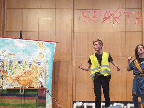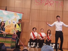 Am Mittwoch, den 13. Juni 2023, war es nach fünf langen Jahren wieder so weit: Der Literaturkurs der Q1 konnte ihr Theaterstück „Der Frieden“, für welches die Schülerinnen und Schüler das gesamte Schuljahr geübt hatten, live in der Aula aufführen.