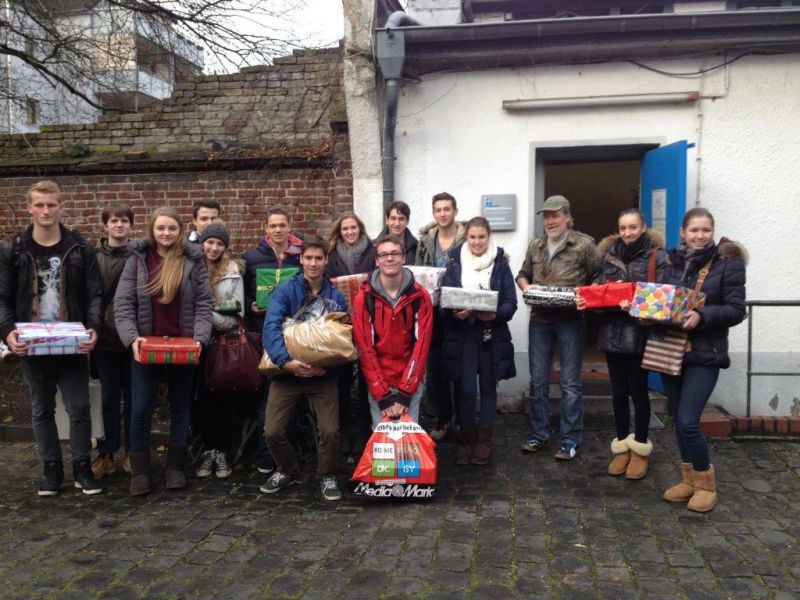 packen SchülerInnen des 10. Jahrgangs unserer Schule nahezu unbemerkt, jedoch zuverlässig und liebevoll Weihnachtspakete für Wohnungslose. 2005 entstand aus dem ersten Kontakt einer Schüler(innen)mutter, Frau Heume, zuständig für die Öffentlichkeitsarbeit der Diakonie Krefeld-Viersen, und unserer engagierten Ex-Kollegin Irmhild Grau diese nunmehr 9-jährige Tradition. Am Heiligen Abend werden auch im Tagesraum der Lutherstraße mit strahlenden Augen die Weihnachtspakete geöffnet, gefüllt mit warmen Socken, dickem Schal, löslichem Kaffee: "Da hat jemand an uns gedacht?!"