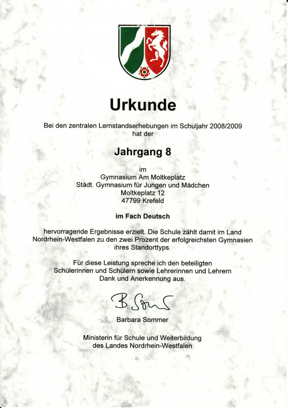 In einer Urkunde der Schulministerin wurden die herausragenden Leistungen im Fach Deutsch der Stufe 8 bei den Lernstandserhebungen im Jahr 2009 gewürdigt. Wir freuen uns und gratulieren allen beteiligten Schülern und Lehrern. Ähnliche Inhalte Abschlussfahrt des Deutsch-Leistungskurses 3 nach Lübeck18.03.2013 | News An Abenden wie diesen …24.09.2012 | News Romfahrt der Q1 (1)16.09.2012 | News Des Literaturkurses "Liebe, L(u)st und Leidenschaft " fürs Theaterspiel03.07.2012 | News Theaterbesuch des Literaturkurses der Stufe 11/1230.05.2012 | News Kategorien Deutsch 2013 Moltke im Vergleich