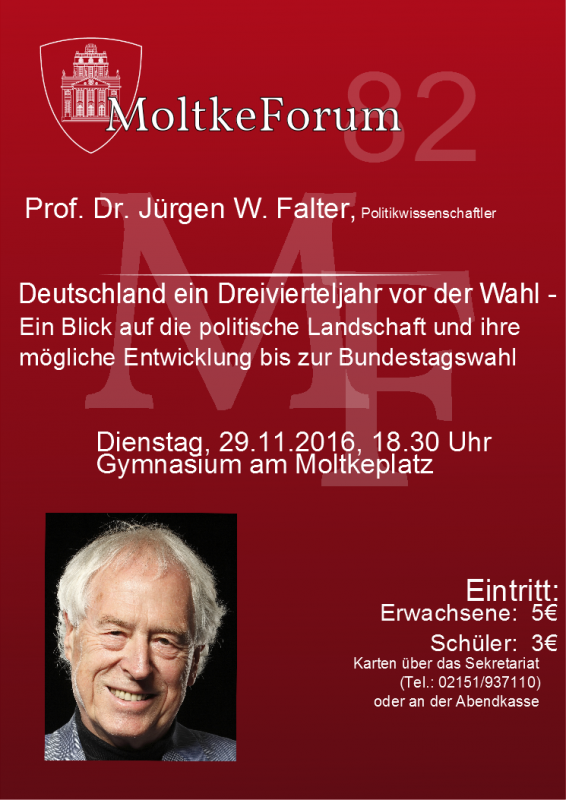 Verändert das Wahlergebnis aus den USA auch unsere Sicht auf das Wahljahr 2017 in Deutschland? Wie sind extremistische politische Positionen in Deutschland zu bewerten? Wie stabil ist die Parteienlandschaft in Deutschland? Um diese und andere Fragen im Vorfeld von Bundestagswahl, Landtagswahl in NRW und Wahl des Bundespräsidenten geht es im nächsten MoltkeForum am 29.11.2016, das ausnahmsweise bereits um 18.30 Uhr beginnt. Der Mainzer Parteienforscher Jürgen W. Falter, weithin bekannt durch seine TV-Präsenz in politischen Magazinen, Diskussionen und Talkshows, beleuchtet umfassend die aktuelle politische Situation in Deutschland.