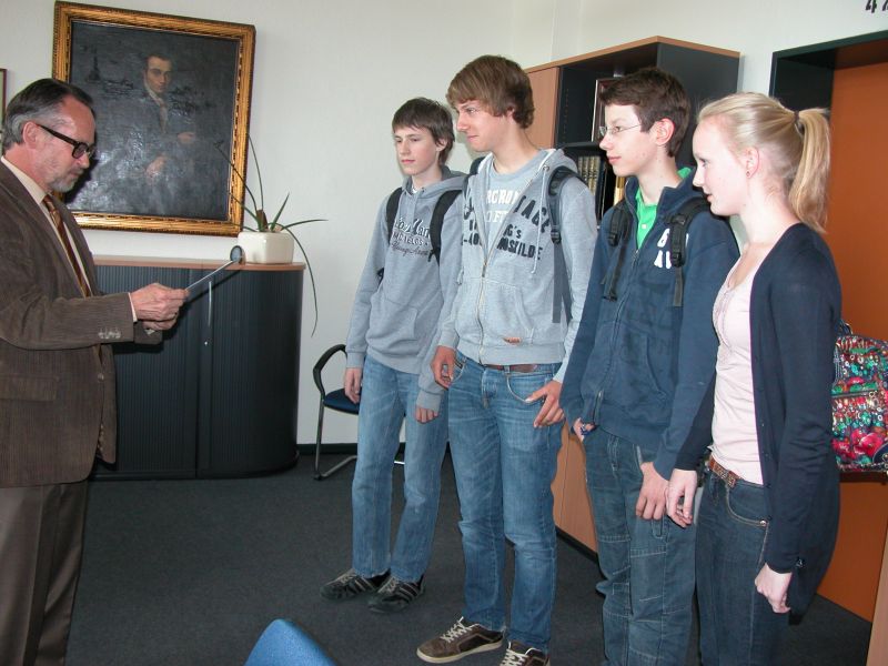Am Bundeswettbewerb Fremdsprachen im Fach Latein haben Alexander Fassin, Max Freundlieb, Jannik Gröne und Leah Meinert (alle Klasse 9b) teilgenommen. Herr Neumann überreichte ihnen Urkunden als Auszeichnung in Anwesenheit von Frau Dr. Verwiebe (Fachlehrerin) und Frau Küster (Regionalbeauftragte der Bezirksregierung Düsseldorf für den Wettbewerb). Die vier Schüler haben Anfang des Jahres einen ganzen Schulvormittag lang an Aufgaben getüftelt, deren Niveau deutlich über den normalen schulischen Anforderungen lag. Jannik Gröne, der schon zum zweiten Mal teilnahm, erreichte dabei die Jury-Bewertung „überdurchschnittlich“. Herzlichen Glückwunsch!