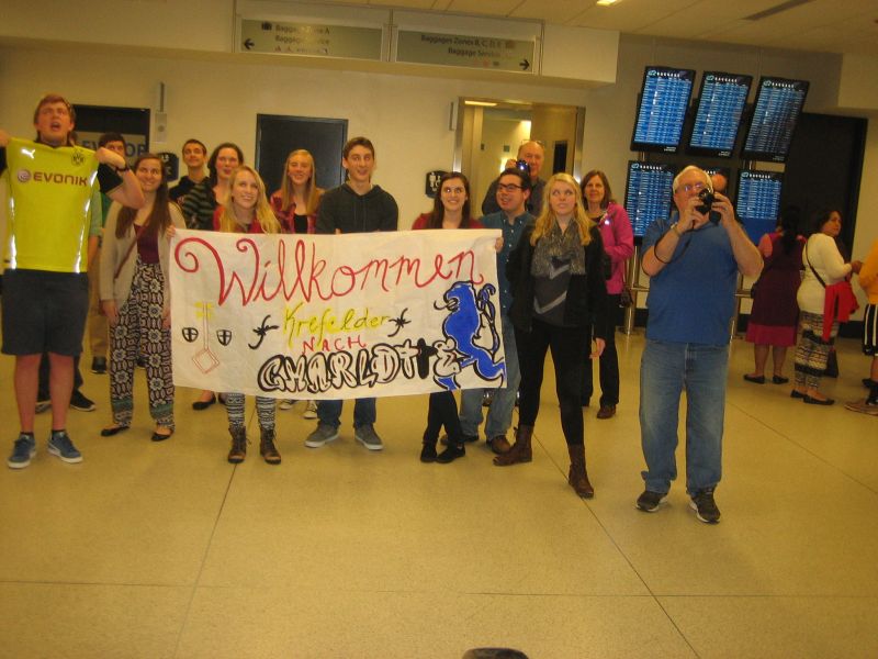 After 18 hours the exchange students and their teachers finally arrived at the Charlotte airport where they were greeted with a very warm welcome. The guests stayed with their host families on the weekend and slowly got to know the American way of life. On Monday the group was welcomed to the school with a typical American breakfast - donuts, muffins, sausage biscuits, and chick fil-a rolls. Then the Germans shadowed the American students in their classes. The next day the exchange group rode on an activity bus and arrived at the US National Whitewater Center: rafting, bicycling, climbing, kayaking under a blazing sun! The group is looking forward to spending the day with Mr Braun's German classes and discussing the theme of "prejudices and discrimination". Special classes have been prepared for Friday and the students can hardly wait until the weekend. Bye from the sunny South! (HB, HM, KN)
