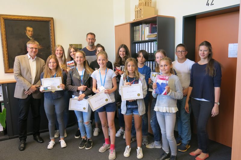 Je nach Abschneiden im Jahrgang, konnten viele SchülerInnen sich über Lektüren, Vokabelhefte, Comics, etc. für ihre guten Leistungen freuen. Im Schulleiterbüro wurden wie in jedem Jahr die Jahrgangsbesten geehrt, sie konnten sich zusätzlich noch über spezielle Zertifikate und weitere Ehrenpreise freuen. Besonders erwähnenswert sind in diesem Jahr die Ergebnisse von Famke Hejstra (5c) als 110. im Land NRW sowie Olivia Halb (8c) als 117. im Landesvergleich.