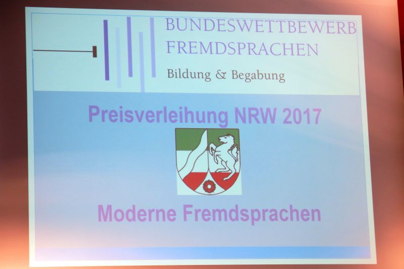 …aber trotz hochsommerlicher, geradezu subtropischer Temperaturen kamen am 30.05.2017 etwa 150 Gäste aus ganz NRW nach Krefeld an unser Gymnasium, um der Preisverleihung an die Landessieger im diesjährigen Bundeswettbewerb Fremdsprachen (moderne Sprachen) beizuwohnen. Erfrischt und gestärkt durch die freundliche und kompetente Bewirtung durch die Q1, die dankenswerterweise das Catering übernommen hatte, erlebten sie in der Aula eine fröhliche und stimmungsvolle Siegerehrung, zu der auch Frau Bürgermeisterin Klaer als Vertreterin der Stadt Krefeld gekommen war.