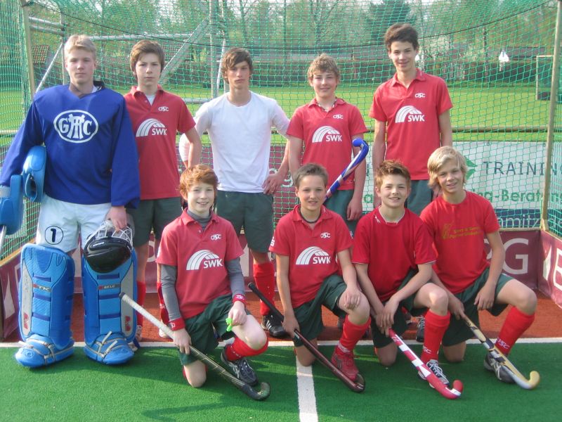 Die Jungen versuchten auf dem Nebenplatz ihr Glück gegen die stark besetzte Mannschaft des Stift.-Hum.-Gymn. aus Mönchengladbach. Aber die Erfolge der Meisterspieler vom letzten Jahr (Finalrunde in Berlin) ließen sich nicht wiederholen. Die erheblich verjüngte Mannschaft war nicht chancenlos, verlor aber klar 6:3. Beim nächsten Mal sind die Chancen bestimmt größer. Die Spieler(innen) auf den Fotos:
