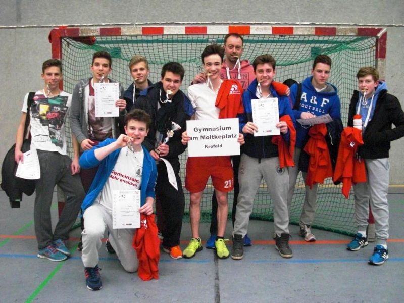 Nach einer zweistündigen Pause, die gemeinsam in launiger Runde in einem benachbarten Café verbracht wurde, reichte uns im abschließenden Spiel sogar ein Unentschieden, um den Titel endlich wieder nach Krefeld zu holen. Das Apostelgymnasium aus Köln hatte unserem Angriffswirbel allerdings wenig entgegenzusetzen und so gewannen wir auch das letzte Spiel mit 5:1.