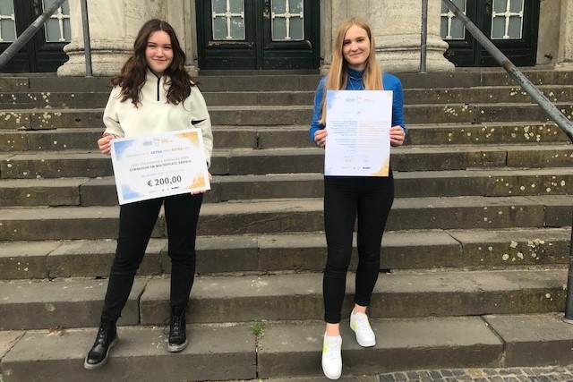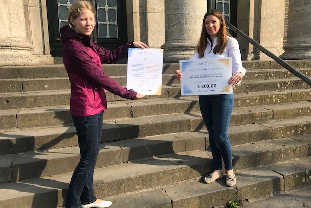 Wir gratulieren Annemarie Rixen und Janne Struckmann ganz herzlich zu ihrem Sonderpreis beim diesjährigen Euregio Schulwettbewerb zum Thema „75 Jahre Freiheit – Leben in der Grenzregion“. Aufgrund des Corona-Virus musste die Preisverleihung in Nijmegen leider ausfallen, stattdessen kam die Organisatorin Frau de Ruiter persönlich zur Preisübergabe ans Moltke. Vorab wurden die Schülerinnen von Julian Binn von Mediamixx für die Euregio interviewt. Janne Struckmann und Annemarie Rixen nehmen bereits zum zweiten Mal am deutsch-niederländischen Schulwettbewerb der Euregio Rhein-Waal teil. Im vergangenen Jahr belegten die beiden Schülerinnen des Krefelder Gymnasiums am Moltkeplatz den zweiten Platz in der Kategorie ab 9. Klasse. Im Interview verraten sie, wofür sie das Preisgeld in Höhe von 500 Euro verwendet haben, wie ihr diesjähriger Wettbewerbsbeitrag zum Thema „75 Jahre Freiheit“ aussieht und was Freiheit für sie bedeutet.
