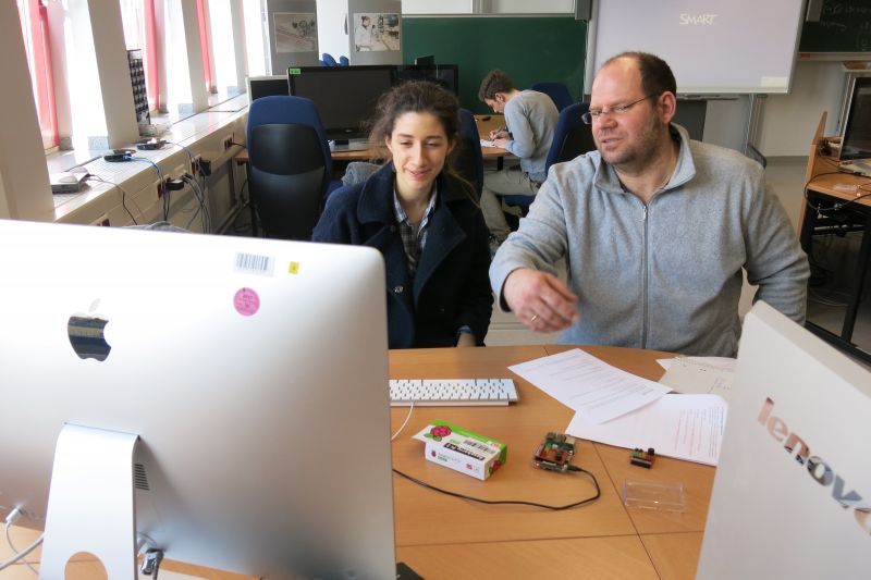 Nach einer sehr herzlichen Begrüßung durch Professor Breil und seinen Mitarbeitern wurde der Tag mit einem Rundgang durch den Fachbereich eingeleitet, im Anschluss erlebten wir in Form einer privaten Vorlesung durch Prof. Breil eine Kurzeinführung in das Betriebssystem des Raspberry Pi, „Linux Bash“, und in „Python“, der im Folgenden angewandten Programmiersprache. Gegen Mittag konnten dann erste kleine Programme erfolgreich geschrieben werden; daraufhin verbrachte der Kurs die wohlverdiente Pause in der hochschuleigenen Mensa.