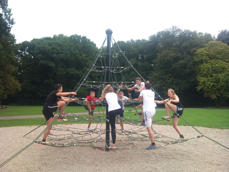Aufgrund der neuen curricularen Vorgaben im Fach Sport wird erstmalig das Profil „Fitness/Ballspiele“ in der Oberstufe angeboten. Zu Beginn des neuen Schuljahrs entwickelten so Schüler/innen einem ihrem persönlichen Fitnesszustand angemessen Parcours im Stadtwald. Hier wurden unterschiedliche Laufstrecken erprobt, als auch verschiedene Kraft-, Schnelligkeits-, Beweglichkeits- und Koordinationsübungen im Freien und an Spielgeräten erarbeitet. Wie auf den Fotos unschwer zu erkennen ist, kann Fitnesstraining auch Spaß machen und so manche Kindheitserinnerung hervorrufen!