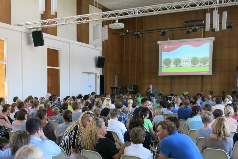 Wer hätte das gedacht? Freitag 05.06.2015, 15:30 Uhr, es ist Brückentag, blauer Himmel, Sonne pur, 33° Grad und die Aula des Gymnasiums am Moltkeplatz ist bis auf den letzten Platz mit Kindern und Eltern gefüllt. Ganz einfach! Es ist Kennenlernnachmittag am Moltke, überall wohin man schaut,  erblickt man neugierige, erwartungsfrohe Gesichter: Wer wird in meiner Klasse sein? Wie sehen unsere Lehrer aus? Kommen meine Freunde aus der Schule auch in meine Klasse? Diese und andere Fragen werden sich unsere neuen Fünfer gestellt haben, als sie Herr Dr. Rademacher herzlich in unserer Schule begrüßte: Es sei schon etwas ganz Besonderes, zum 100. Geburtstag des Gebäudes Schüler/in des Moltke zu werden. Umso größer sei die Freude bei der ganzen Schulgemeinschaft, dass sich wieder so viele Kinder für unsere Schule entschieden hätten. Dem liebevollen Herzlich-Willkommen des Schulleiters, das mit viel wohlwollendem Beifall bedacht wurde, folgte Herr Dr. Zöllner, der zunächst kurz über das Programm des Nachmittags referierte. Kurz hielt er sich, denn die Spannung im Saal war spürbar groß. Noch kürzer fasste sich Frau Akdas in ihrer Begrüßung, die gemeinsam mit Herrn Dr. Zöllner die Erprobungsstufe koordiniert. Und als Herr Puneßen von den SWK die Vorzüge des SchokoTickets erläutert und Herr Pyschik, Frau Bony-Wefers und Frau Pfeiffer über die Hausaufgabenbetreuung informiert hatten, war er endlich gekommen, der Augenblick der neuen Fünftklässler, die Zusammensetzung der neuen Klassen: 5a, 5b und 5c. Frau Brantl und Herr Pyschik, die das Klassenlehrerteam der 5a bilden, riefen nun abwechselnd die Namen ihrer neuen Schülerinnen und Schüler auf, die sich sodann vor der Bühne links und rechts neben ihren neuen Lehrern sammelten. Ein wunderschönes Gefühl für alle Beteiligten! Anschließend stürmten die Klassen und ihre Teams (5b, Frau Franck und Herr Dr. Ginzel; 5c Frau Lorkowski und Herr Rademacher) in die vorbereiteten Räume, um sich das erste Mal gegenseitig zu „bestaunen“ und auszutauschen. Während die Kinder aufgeregt ihre neuen Lehrer mit Fragen löcherten, informierte Herr Dr. Zöllner die Eltern über die ersten Schultage am Moltke und gab noch wichtige organisatorische Hinweise. Anschließend genossen Eltern und Schüler kühle Getränke, die eine oder andere Tasse Milchkaffee und ein leckeres Stück saftigen Obstkuchen. Auch unsere Moltke-T-Shirts und Polohemden, die Frau van Blanken-Möckel an einem speziell für den Nachmittag aufgebauten Stand zum Verkauf anbot, fanden neue (kleine und große) Besitzer. Als gegen 17:00 Uhr die letzten Eltern und Kinder das Gebäude verlassen hatten, war eins klar geworden: „In Krefeld kann der Sommer ausgebrochen sein, wenn das Moltke seine neuen 5er begrüßt, steht die Sonne im Schatten.“