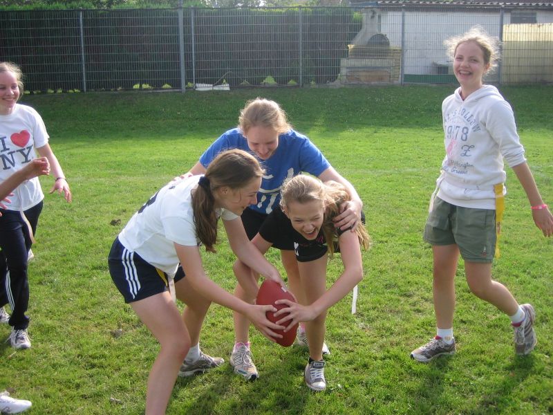 Mädchen der Klasse 7 zeigen, wie man Flag Football spielt, eine entschärfte Variante des American Football. Es geht darum, den Ball ("das Ei") hinter die gegnerische Grundlinie zu transportieren. Der Gegner kann durch Abreißen der Flag ("Schwänzchen") daran gehindert werden. Mal was anderes als Fussi.