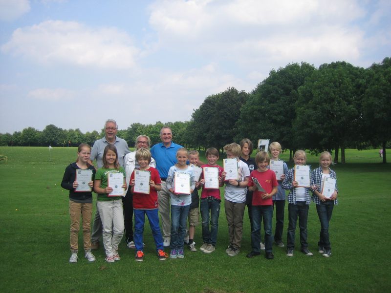 12 Teilnehmer der Golf AG "Abschlag Schule" erhalten vom Pro Bob Lamb und der Jugendwartin Birgit Pagnia das Silberne Golfabzeichen. Fast ein Jahr lang haben sie geübt: Voller Schwung auf der Driving Range, Pitch, Chip, Putt, Etikette, Regeln u.s.w. Einige Eltern konnten sich z.T. erstaunliche Ergebnisse ansehen und durften sogar selbst den Schläger schwingen. Auch im nächsten Jahr wird der Golfverband ein ähnliches Projekt für Einsteiger großzügig unterstützen. Vielen Dank auch an den kooperierenden Golfclub "Op de Niep".