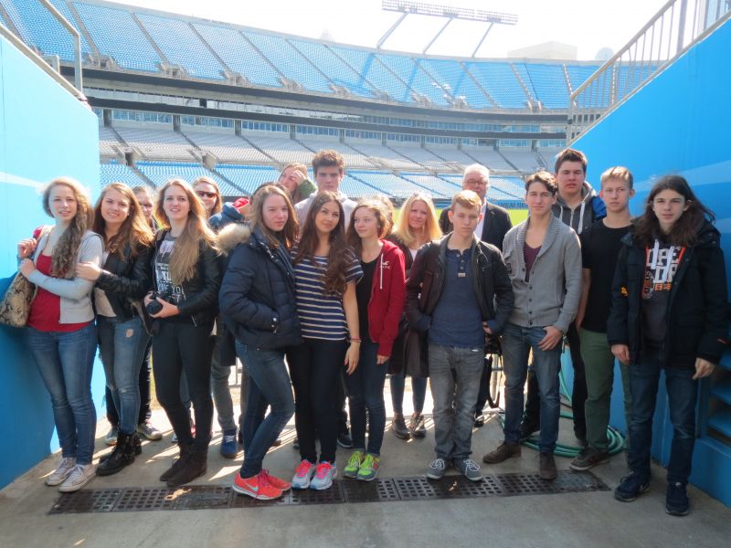 It's almost time to say goodbye to Charlotte. The students had a really busy last week: working on their projetct, visiting special classes, taking part in school sports or the choir. They spent the weekend with their families and enjoyed different activities like laser tag, basketball or hockey games. On Monday the group took the train(!) to Downtown Charlotte and made a tour at the Levine Museum of the New South- "From cotton fields to skyscrapers". The next day the Germans shadowed their hosts at school. Wednesday was Panthers day! John, the tour guide, told the group many intersting facts about the famous "Bank of America stadium"- home of the Carolina Panthers football team! Finally, parents, students and teachers were able to say goodbye to each other at a delicious potluck dinner at school. Only two days are left...and there are still lots of things to do! The countdown to New York is on!!!
