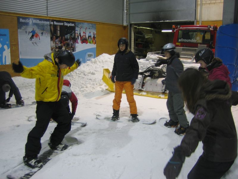 Während überall in Krefeld Schneeglöckchen und Krokusse den nahenden Frühling ankündigen, verlängerte die 8a die Wintersaison mit einem Besuch in der Skihalle in Neuß. Der Besuch war hervorragend organisiert von Frau Nacken und Frau Schlieper, die zusammen mit Herrn Knur und Frau Küster die Klasse begleiteten. Am Vormittag hatten die Schüler Unterricht, sie konnten dabei zwischen Ski- und Snowboardfahren (bzw. –fallen :-)) wählen. Alle Schüler stellten sich so motiviert und geschickt an, dass sie die zwei zusätzlichen Stunden Freifahrt am Nachmittag voll ausschöpfen wollten. Manche waren sogar bereit, auf das köstliche Mittagessen ( Currywurst mit Pommes, für die Vegetarier Pommes mit Pommes) zu verzichten, und mussten fast gezwungen werden, ihre Energiereserven aufzufüllen (Dank an Frau Schlieper für die Knoppers!). Zum Schluss waren alle Schüler – auch die absoluten Anfänger - so weit, dass sie von „ganz oben“ die Piste heruntersausen konnten, wobei dann manchmal nur der Zaun ihre wilde Fahrt zu bremsen vermochte!