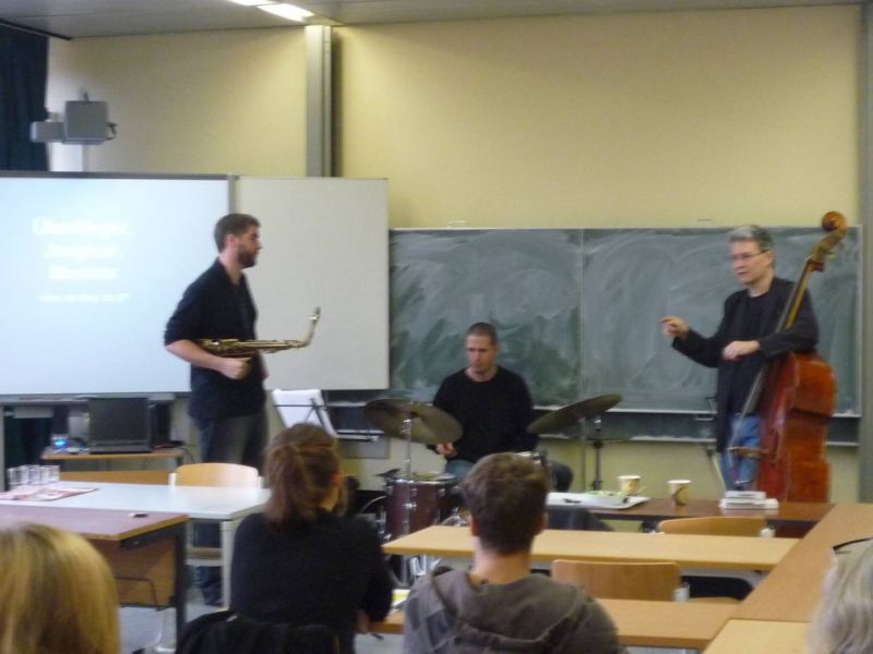 Goldsby, Duncan und Tiemann berichteten den 22 LK-Schülern von ihren persönlichen Erfahrungen, z.B. vom Werdegang eines Jazzmusikers oder wie man als Jazzmusiker seinen Lebensunterhalt verdient. Auch über die Geschichte des Jazz erzählten sie und über den Einfluss des Jazz auf andere Musikformen, wie Popmusik, Hip-Hop und Soul.