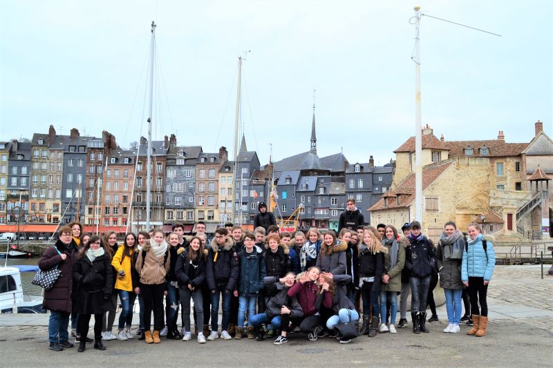 Am 16. März 2018 war es endlich so weit: der Frankreichaustausch begann. Voller Vorfreude stiegen 25 Schülerinnen und Schüler, Frau Dederichs und Frau Schwieres in den Bus, in der Hoffnung, eine nette Austauschschülerin bzw. Austauschschüler kennenzulernen. Nach ca. 8 Stunden Fahrt kamen wir in Gaillon an der Austauschschule „Lycée André Malraux“ an. Wir wurden unseren Partnern zugeteilt und sind anschließend mit ihnen nach Hause gefahren. Nun verbrachten wir das Wochenende mit unserer Gastfamilie und haben einiges unternommen. Viele von uns waren beispielsweise in Paris, haben den Eiffelturm und den Louvre besucht. Manche haben Lasertag gespielt oder waren im Museum. Am Montag gingen wir in die Schule und besuchten den Mathe-, Deutsch-, Französisch- oder Englischunterricht. Der Unterricht war teilweise schwer zu verstehen, da die Franzosen sehr schnell sprechen, doch es war auf jeden Fall sehr interessant gesehen zu haben, wie der Unterricht in Frankreich abläuft. Die Schüler schreiben fast die ganze Zeit von der Tafel ab, während der Lehrer dazu etwas erklärt. Anschließend müssen sie Aufgaben zum Thema bearbeiten. Mündliche Mitarbeit war dort so gut wie nicht vorhanden. Danach sind wir zum „Château Gaillon“ gegangen und erhielten dort eine Führung. Die nächsten vier Tage unternahmen wir noch viele andere schöne Dinge. Beispielsweise fuhren wir alle nach Rouen, besichtigten dort die große Kathedrale und ein Museum über Jeanne d´Arc. Außerdem fuhren wir nach Trouville an den Strand und machten eine Stadtrallye durch Honfleur. Bei unseren Austauschpartnern zu Hause haben viele von uns ein typisch französisches Gericht gekocht. Meine „corres“ (Austauschpartnerin) und ich haben Kartoffelgratin mit sautiertem Schweinefleisch und Backpflaumen sowie gegarten Äpfeln gekocht. Aus allen Rezepten, die wir zusammengestellt haben, werden wir ein gemeinsames deutsch-französisches Kochbuch erstellen. Bon appétit! Irgendwann war jedoch leider der Abschied gekommen. Also versammelten wir uns am Freitag, den 23. März am Bus, um „bis bald“ zu sagen. Uns allen hat der Austausch sehr gut gefallen und es war eine sehr schöne Erfahrung. Es war es wert, mitgefahren zu sein, jedoch waren wir nach der achtstündigen Busfahrt froh, wieder zu Hause sein!