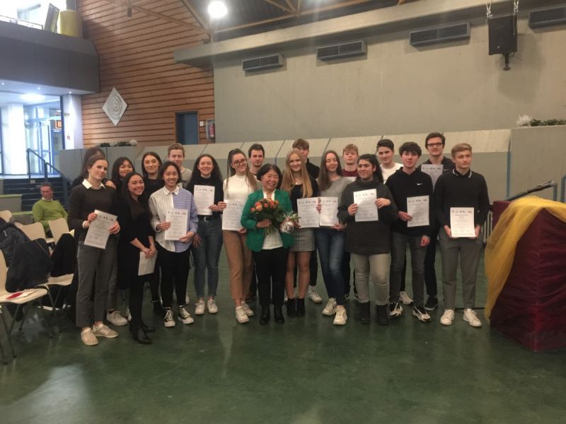In einer Feierstunde am Gymnasium Horkesgath wurden am 9. Dezember 2019 die Teilnehmerinnen und Teilnehmer der dreijährigen Chinesisch-AG nach bestandener Abschlussprüfung geehrt. Unser Gymnasium durfte sich gleich über drei Absolventen und eine Absolventin freuen: Daniel Herrador León, Christian Palm, Marc Nekes und Janne Struckmann aus der Jahrgangstufe Q1 durften ihre Urkunden von Frau Fengshi Yang, der Chinesisch-Lehrerin, und Herrn Heinz Strohe, der seit diesem Schuljahr die Planung und Organisation der Chinesisch-AG und des Chinaaustausches von Frau Dr. Maria Köhler-Degner übernommen hat, in Empfang nehmen. Die Überreichung der Zertifikate war für unsere Schülerinnen und Schüler neben dem Austausch mit Hangzhou im vergangenen Jahr der krönende Abschluss der letzten drei Jahre, in denen sie sich neben anderen Verpflichtungen die Zeit genommen haben die meist gesprochene Sprache der Erde zu lernen.