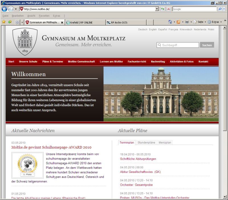 Krefeld (RPO) Das Krefelder Gymnasium am Moltkeplatz ist für seinen Internetauftritt www.moltke.de mit dem deutschen Schulhomepage-AWARD 2010 ausgezeichnet worden. In einem mehrmonatigen Auswahlverfahren konnte sich das „Moltke" mit dem ersten Platz gegen fast 600 Teilnehmer aller Schulformen aus Deutschland, Österreich und der Schweiz durchsetzen.