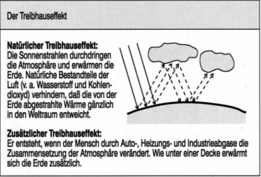 In der Erdatmosphäre befinden sich die sog. Spurengase. Relativ ungehindert lassen sie die kurzwellige Strahlung passieren. Die langwellige Strahlung dagegen nicht. Teilweise reflektiert die Erdoberfläche diese langwellige Strahlung zurück zur Erdoberfläche.